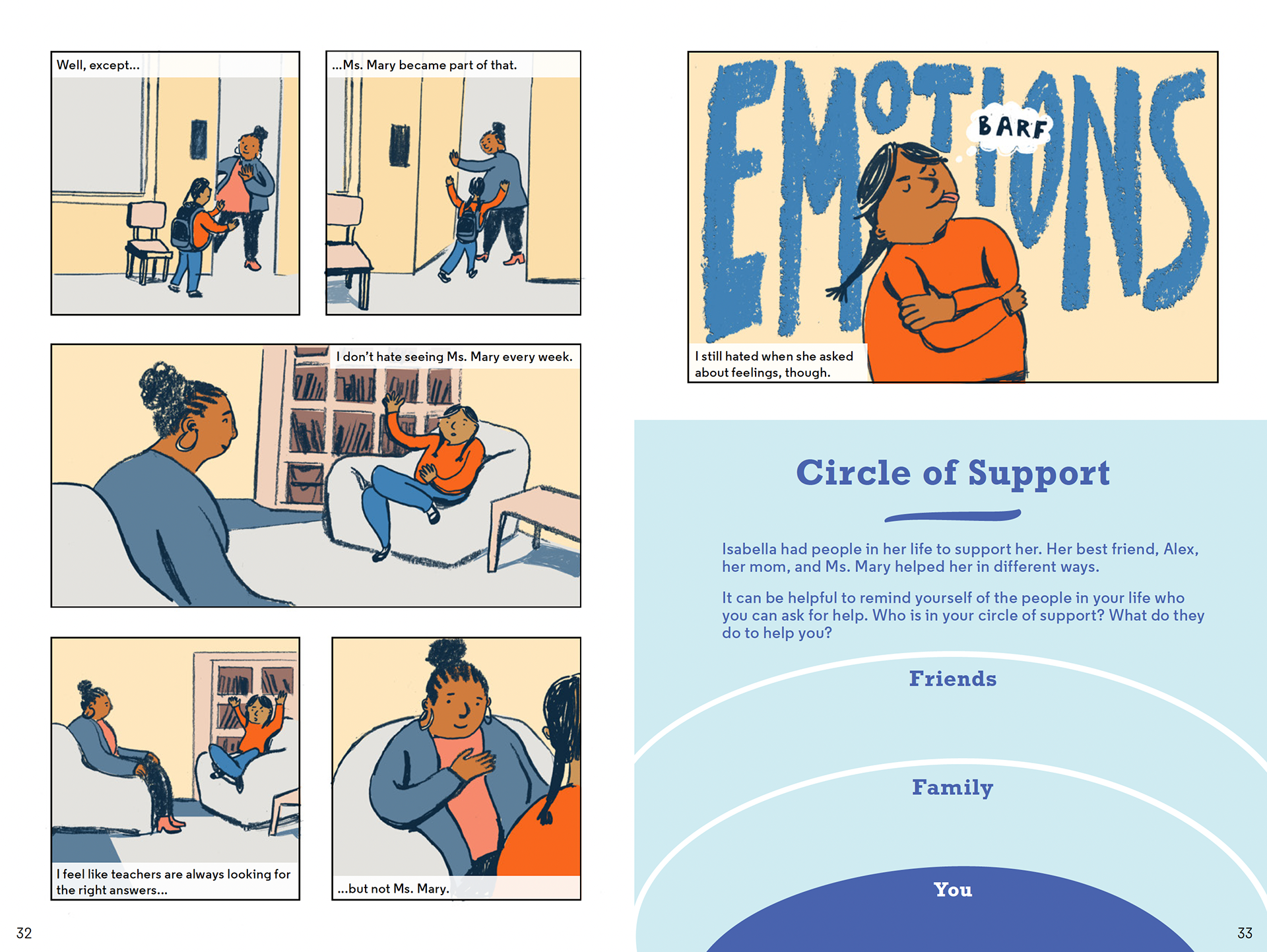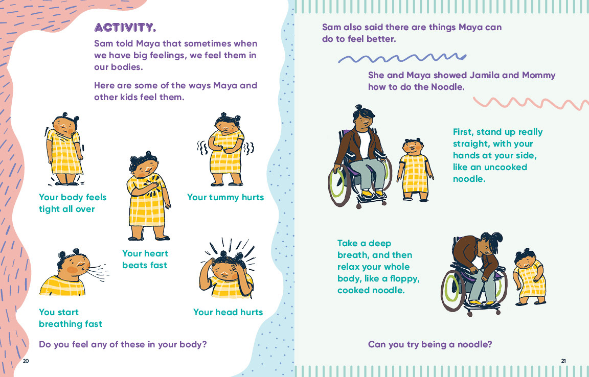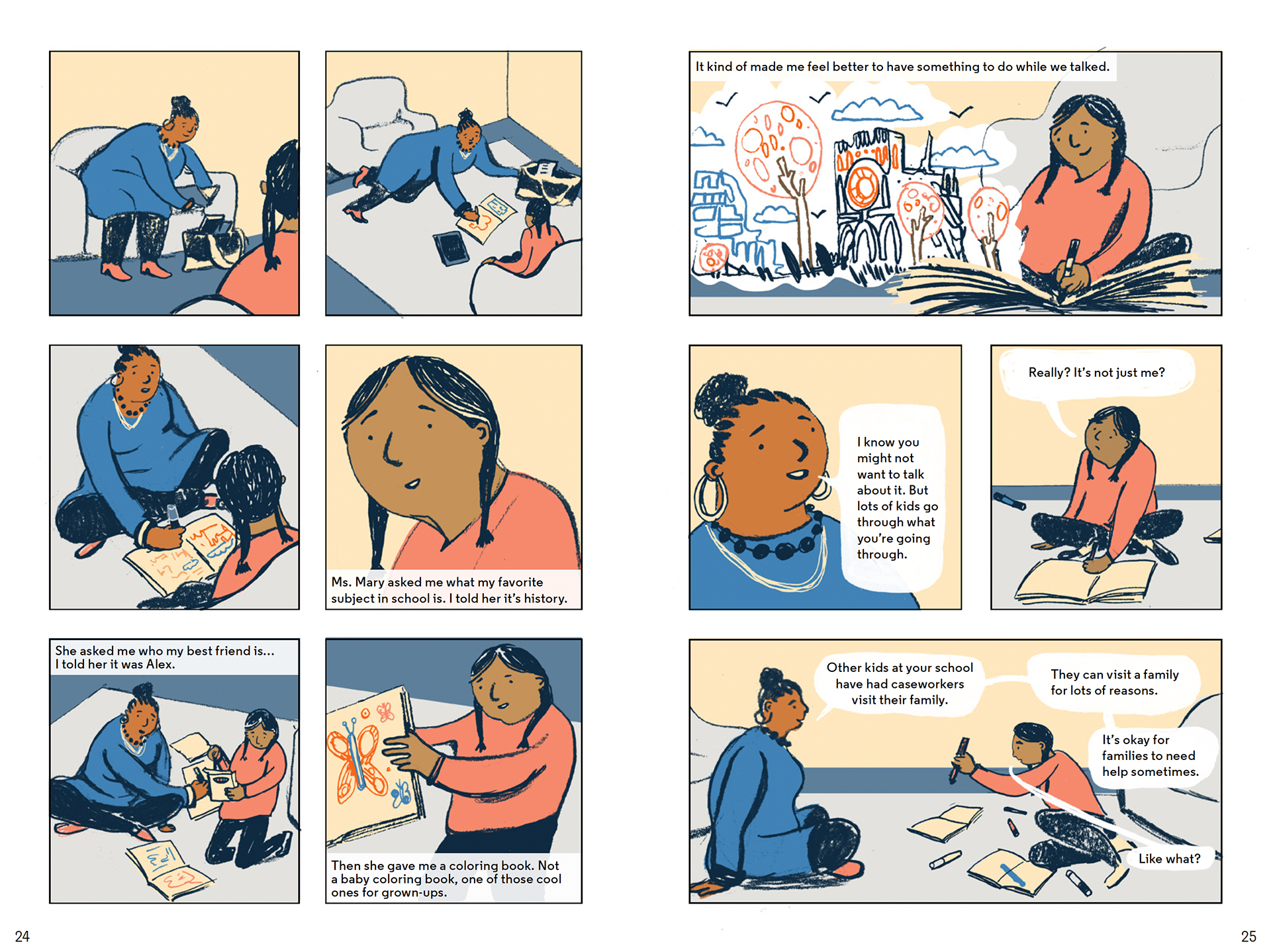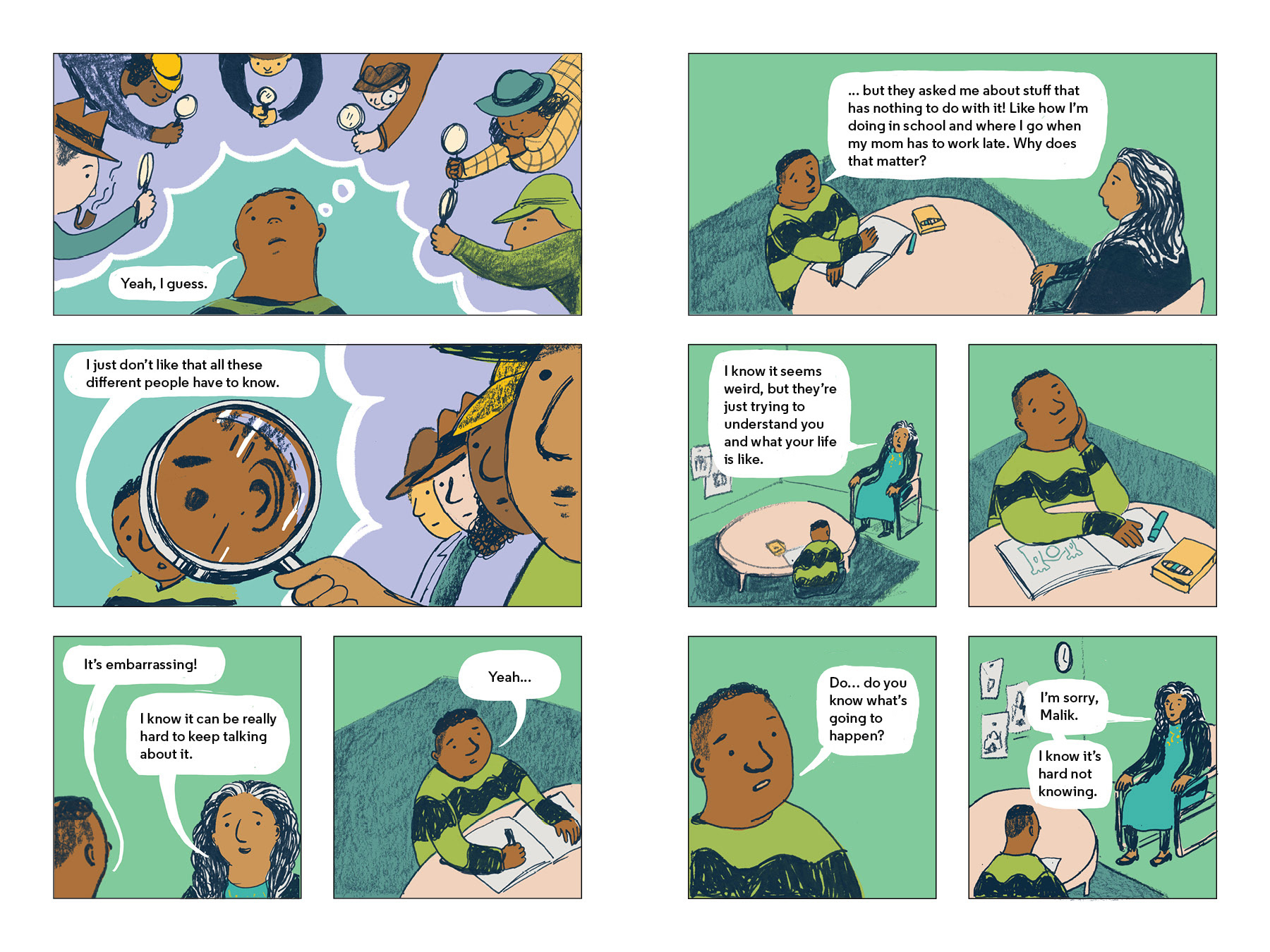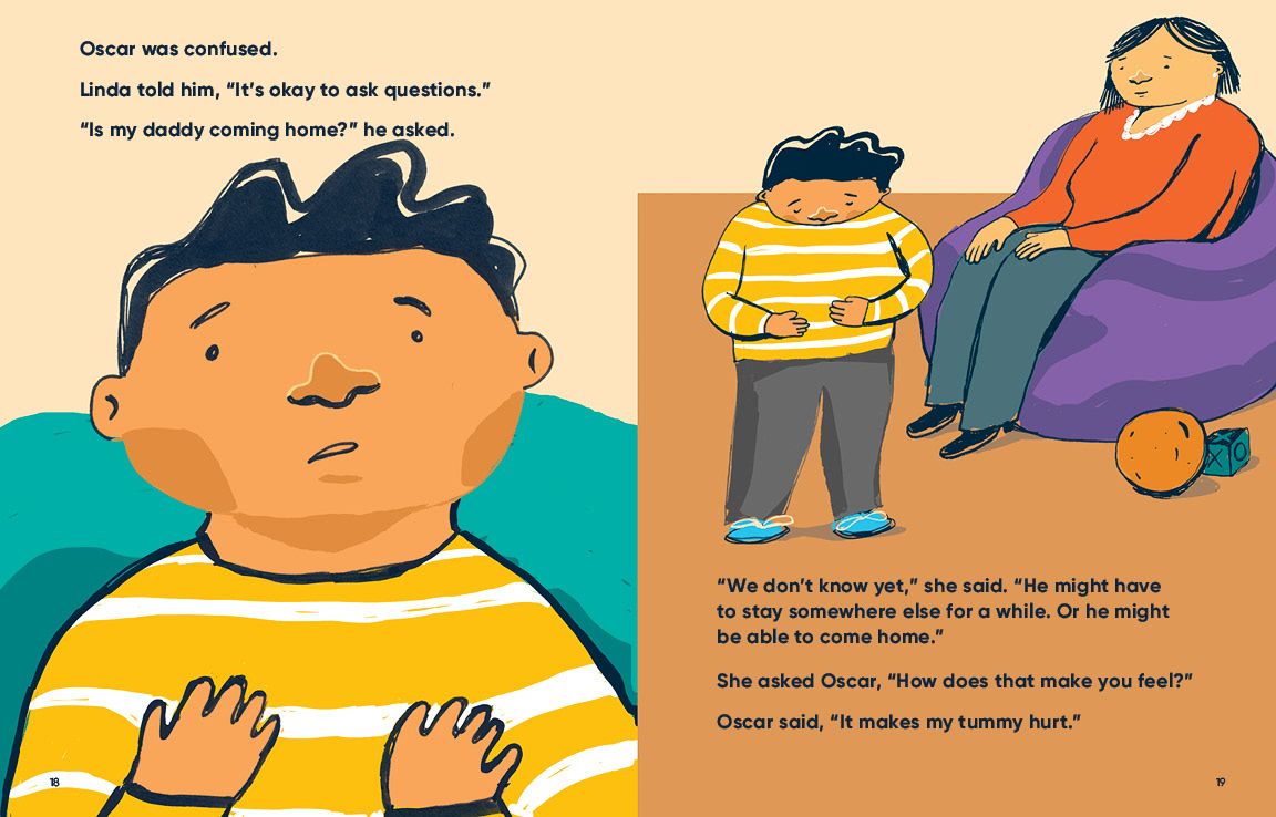 The spreads below are excerpts from I am Malik and I am Isabella. In these scenes, Malik and Isabella process what has been happening and how they are feeling about it with child therapist.