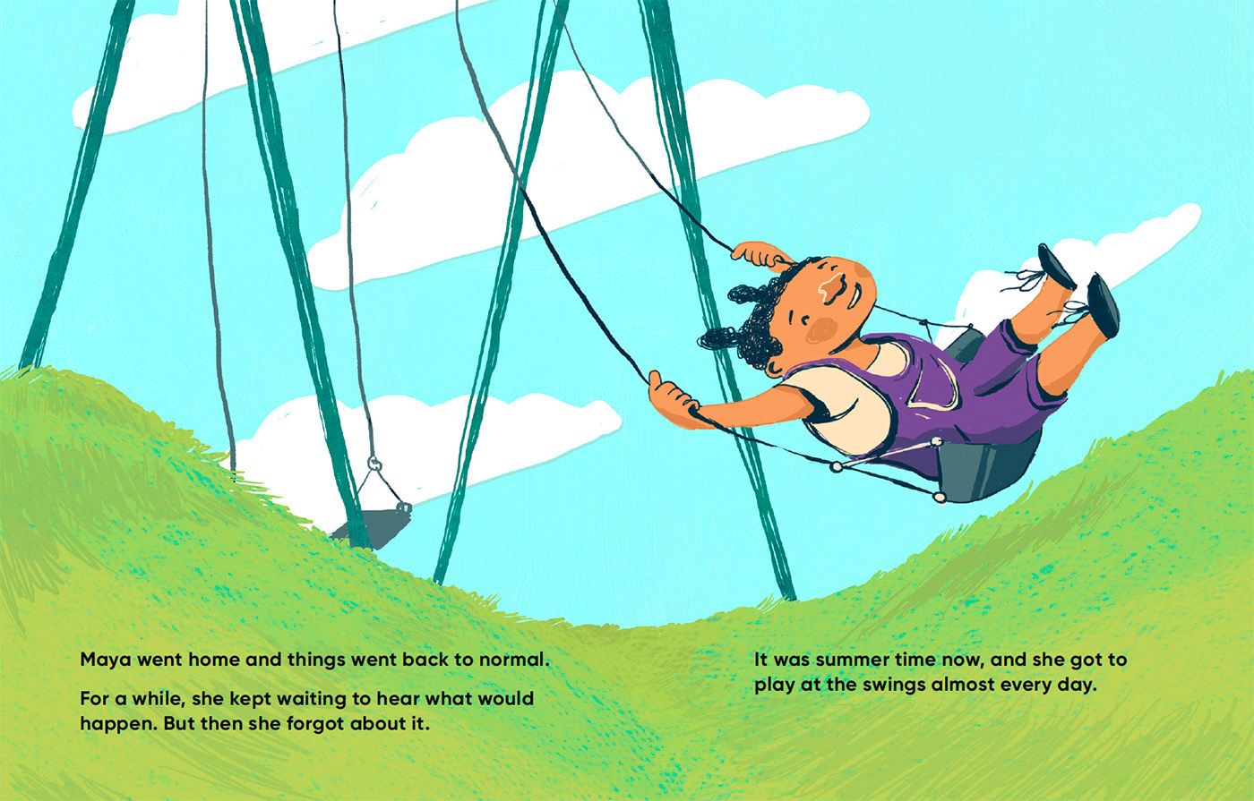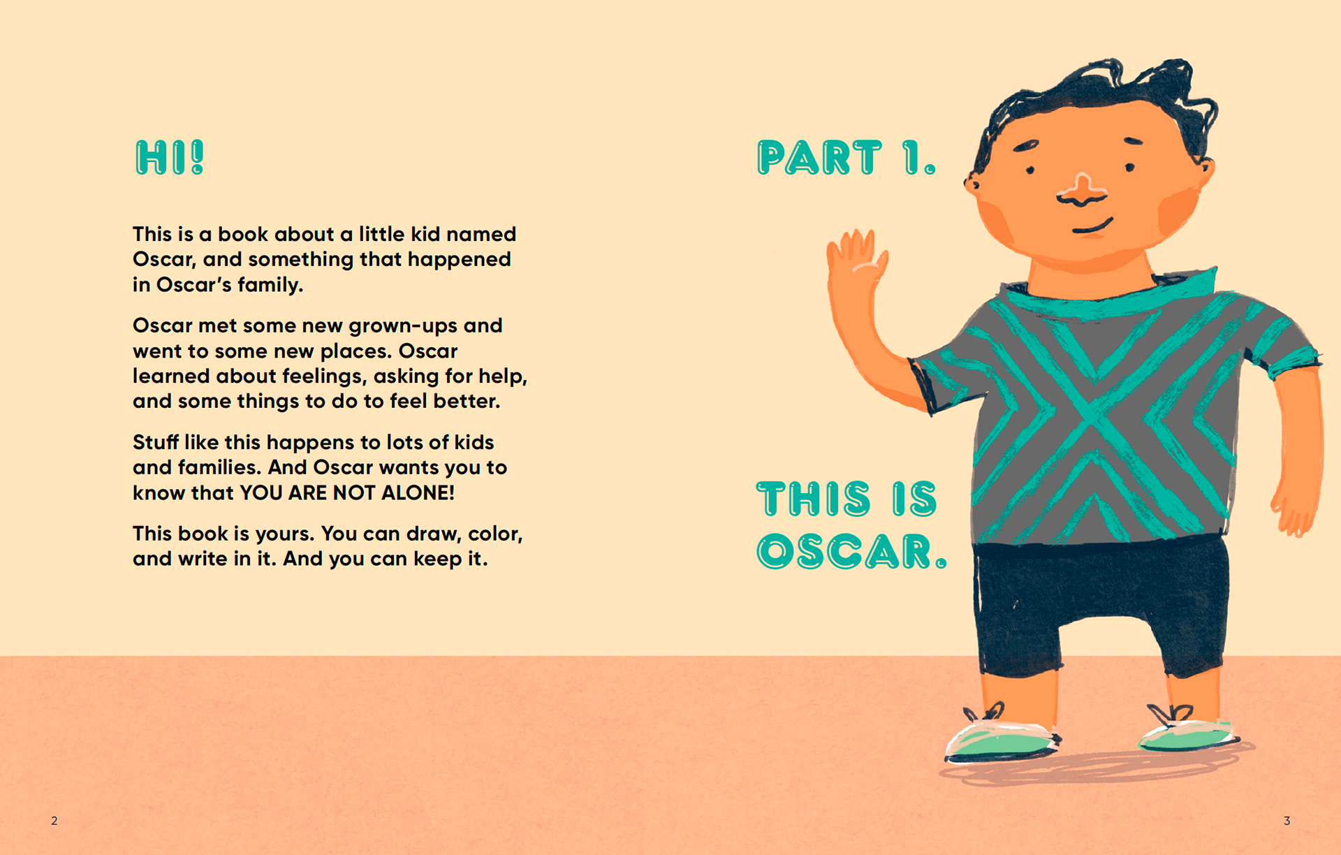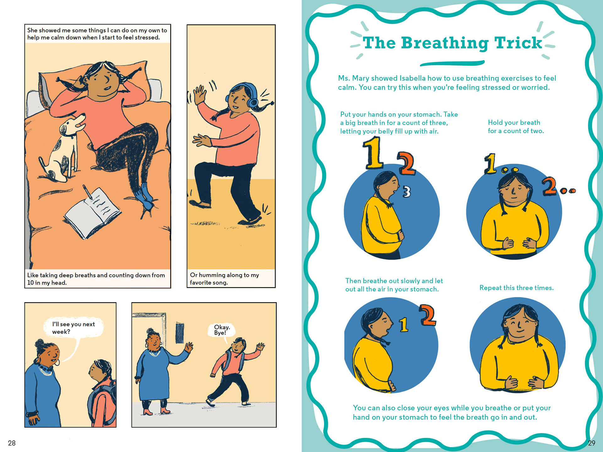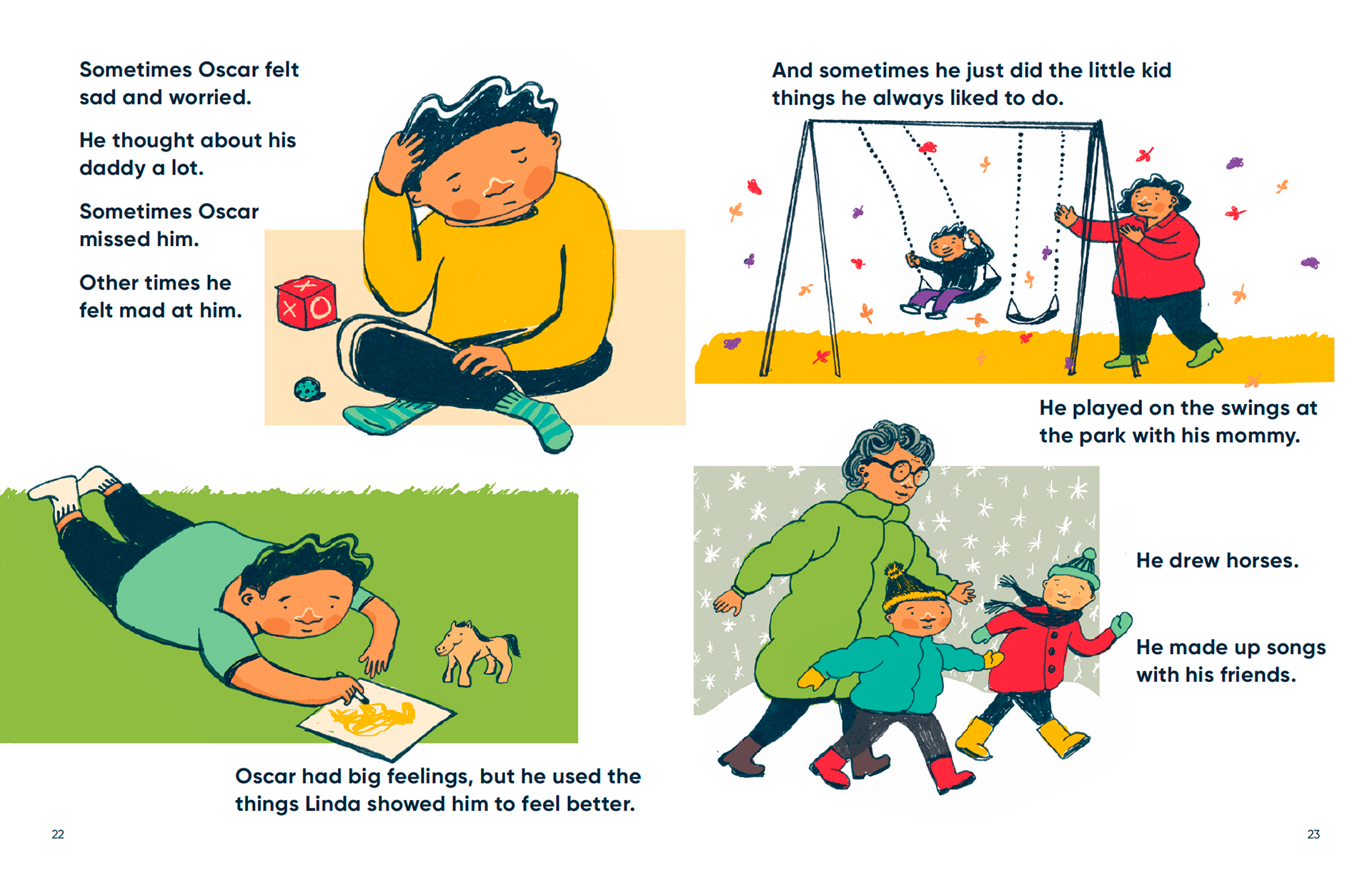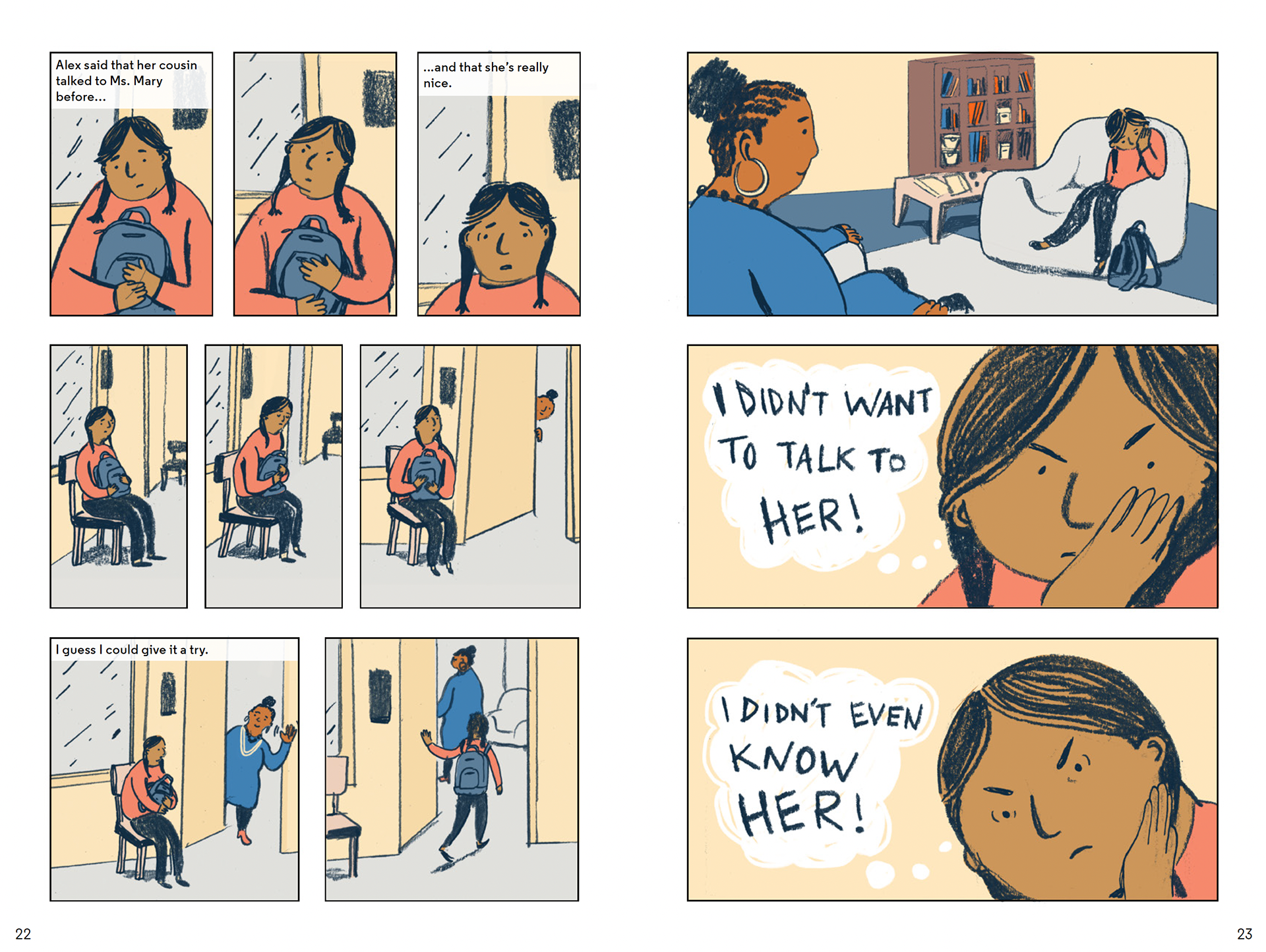 The spreads below are excerpts from I am Malik and I am Isabella. In these scenes, Malik and Isabella process what has been happening and how they are feeling about it with child therapist.