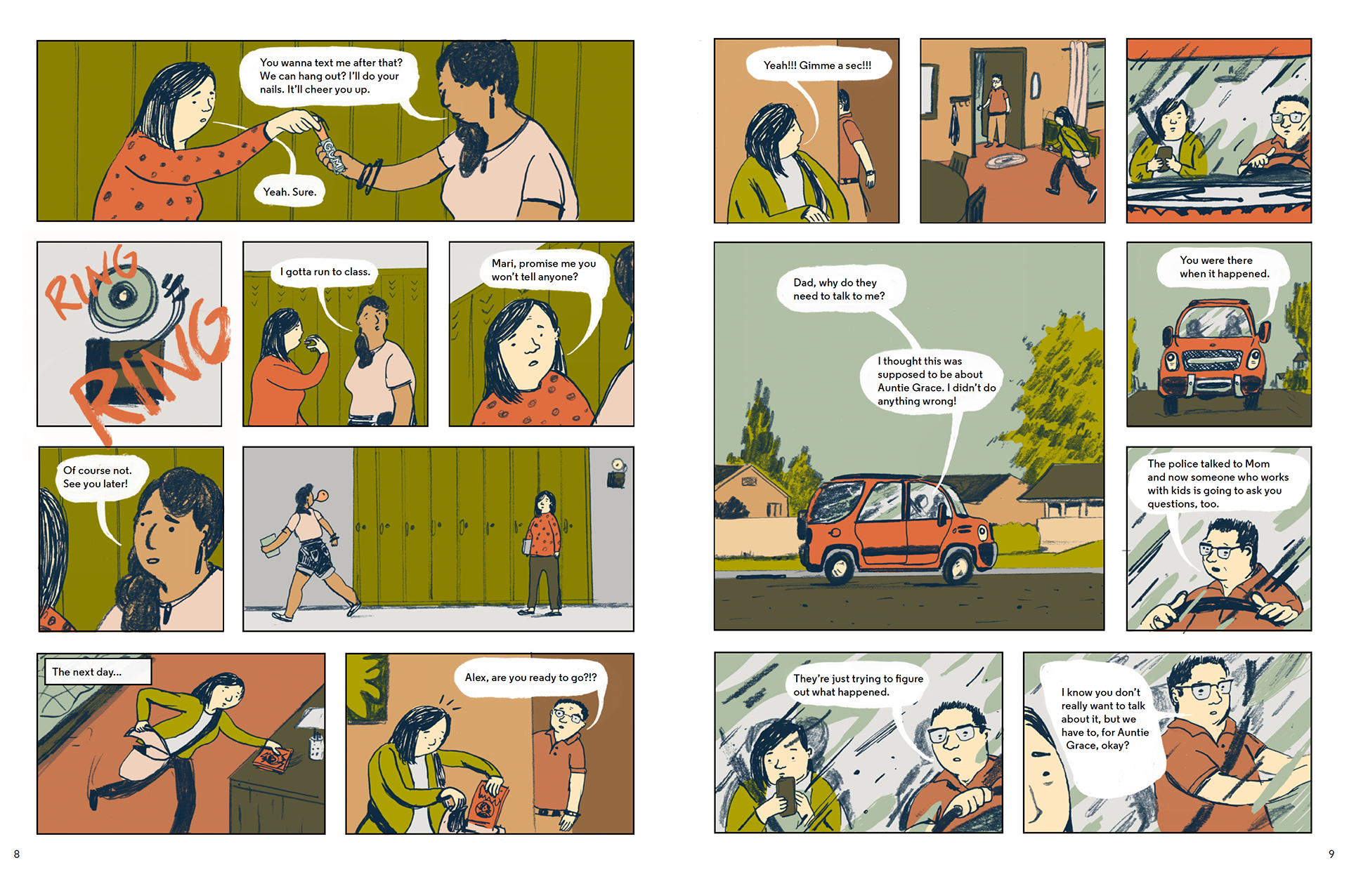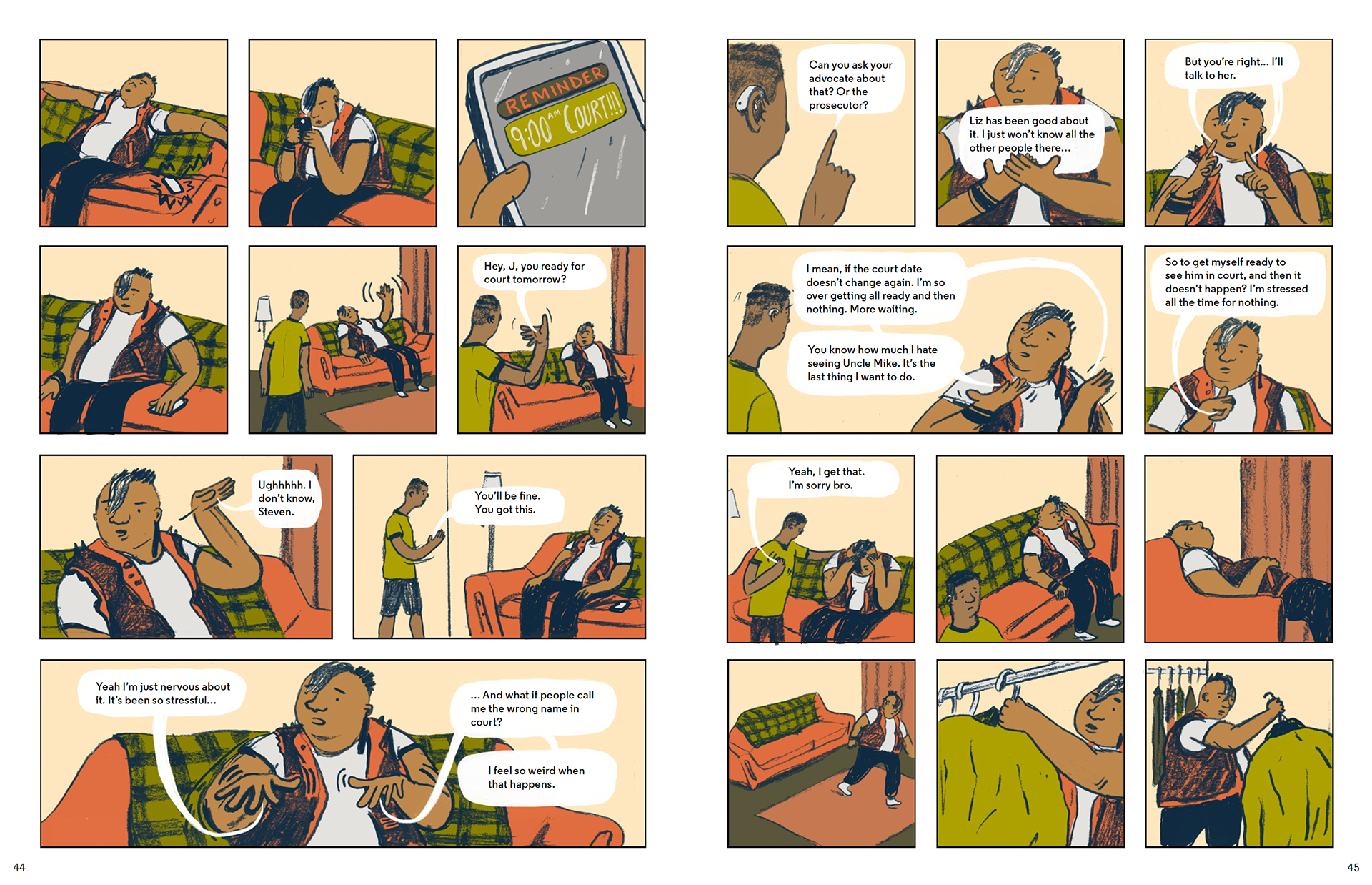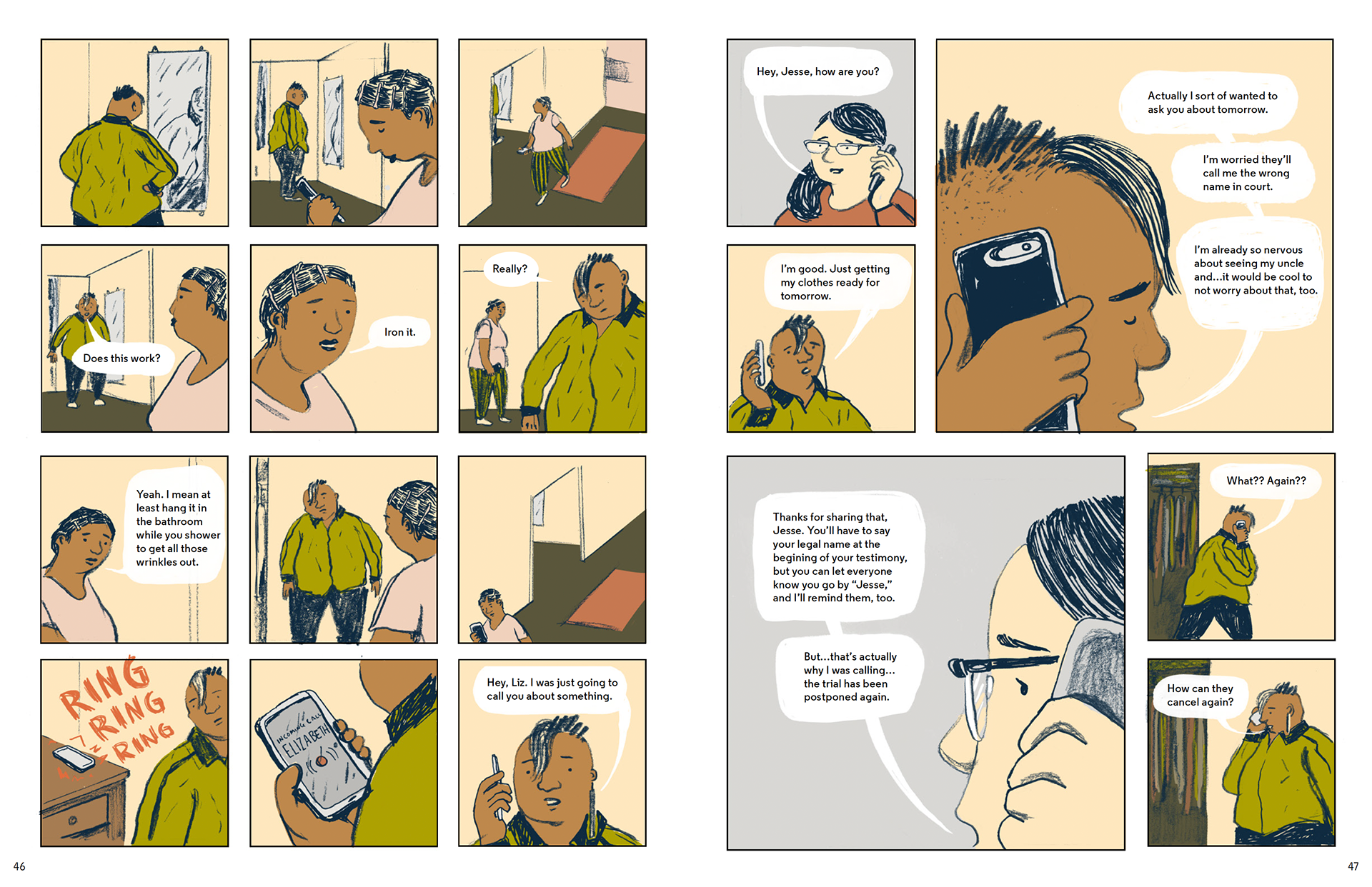 The spreads below depict characters navigating school, family and friend relationships while dealing with an ongoing court case.