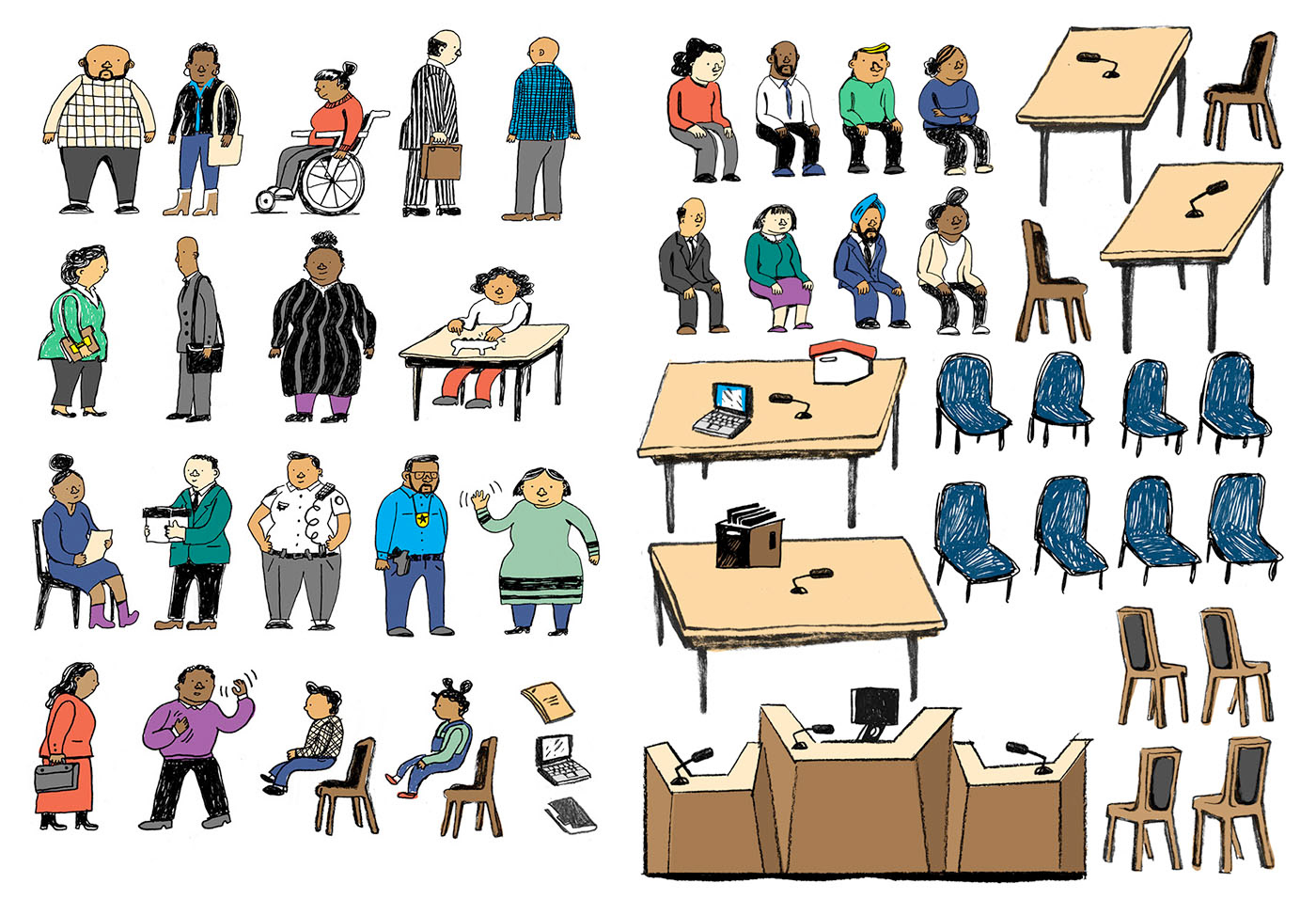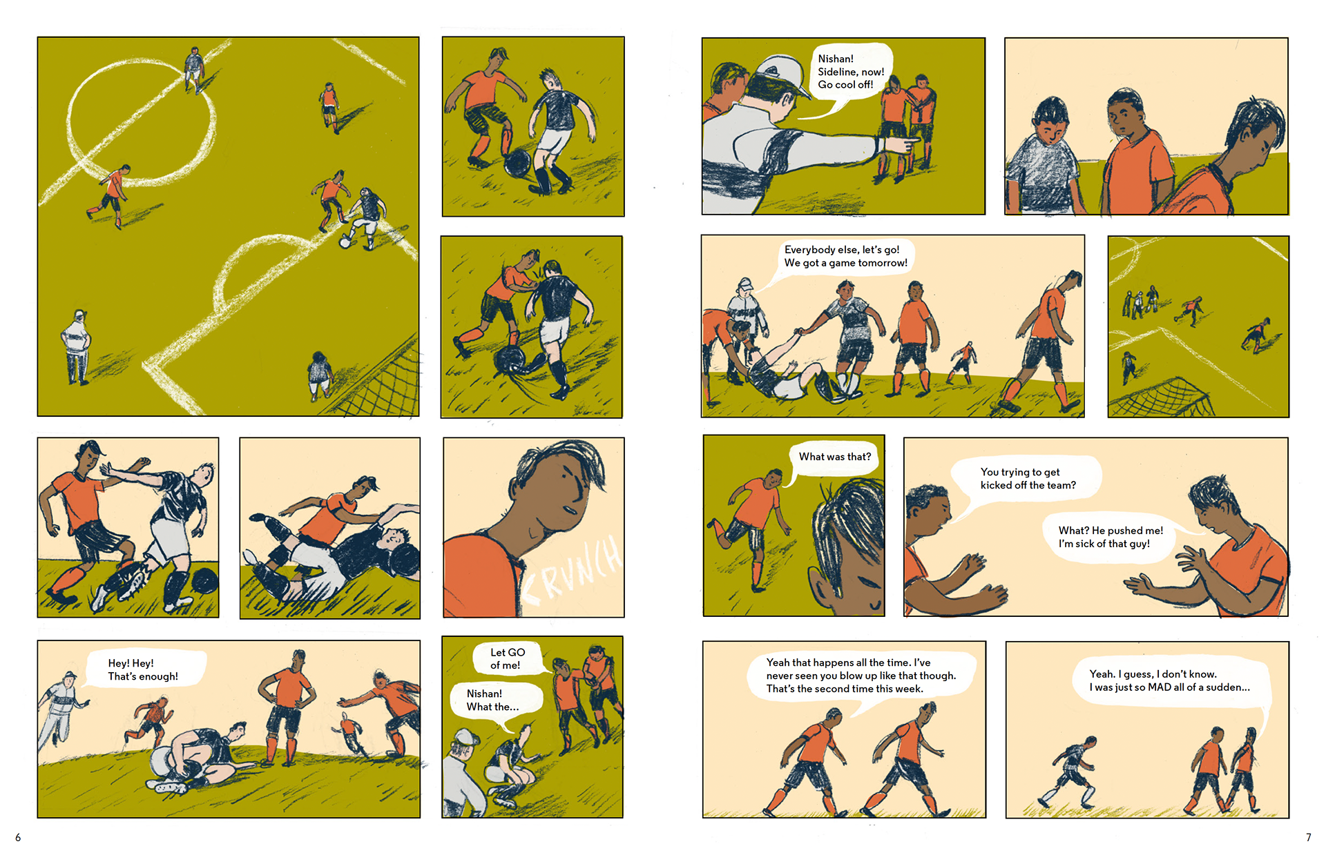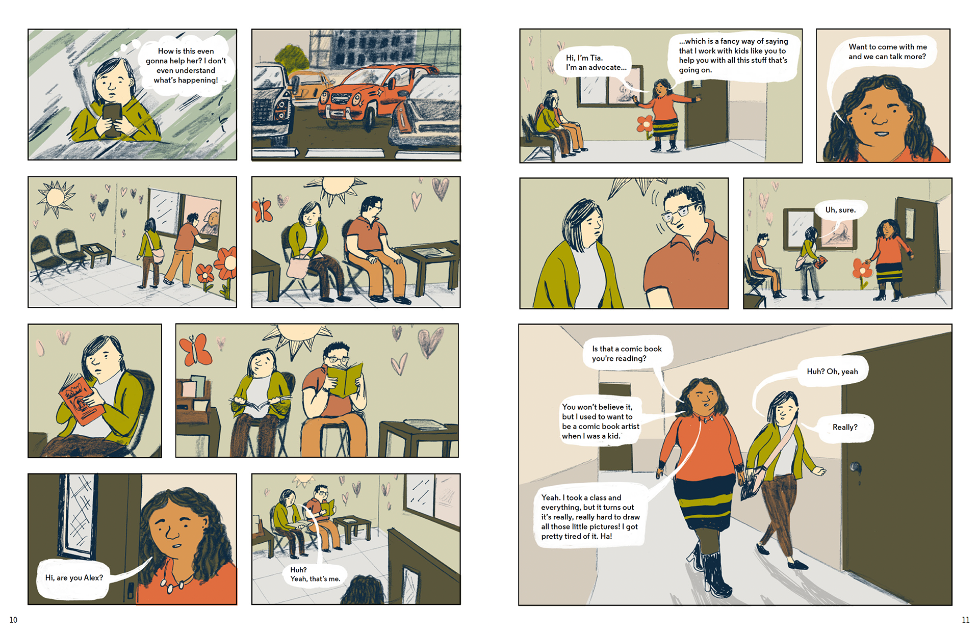 The spreads below depict characters navigating school, family and friend relationships while dealing with an ongoing court case.