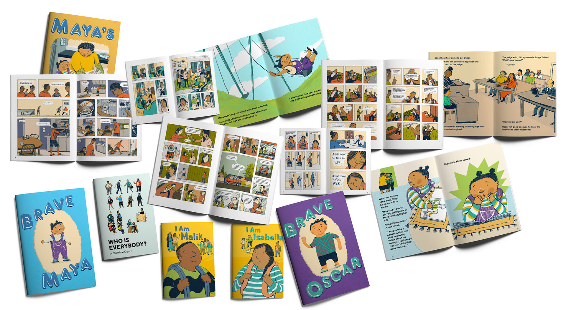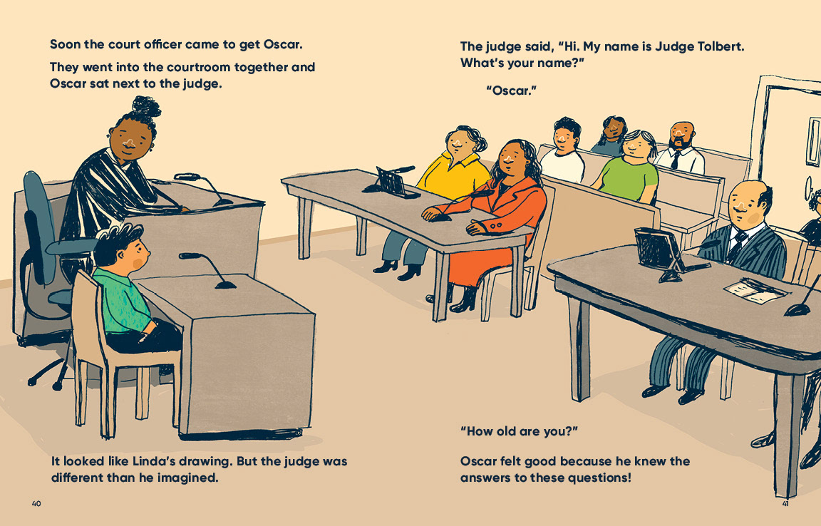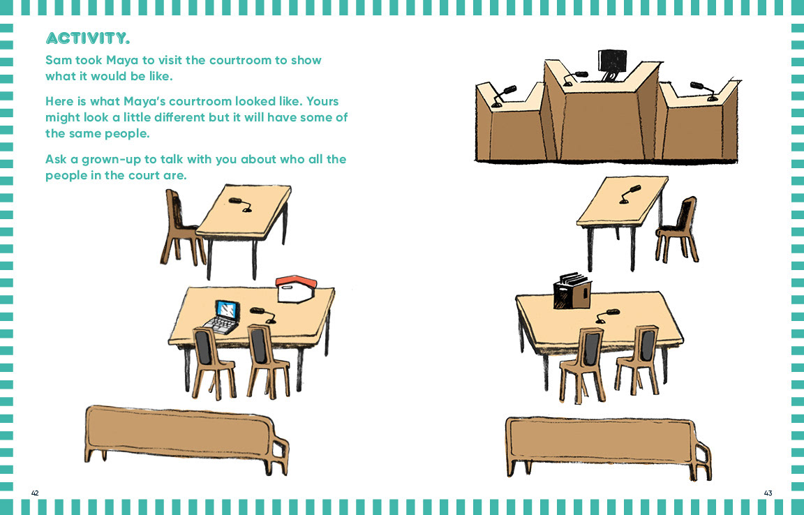 For this age group, the team produced three picture books that are specific to family court, criminal court, and outcomes that involve foster care. The books contain narratives designed to be open enough for youth advocates and caregivers to adapt to the specifics of a child's particular situation. They also contain activities that help a child understand and cope with the disruption and trauma that come with court cases.