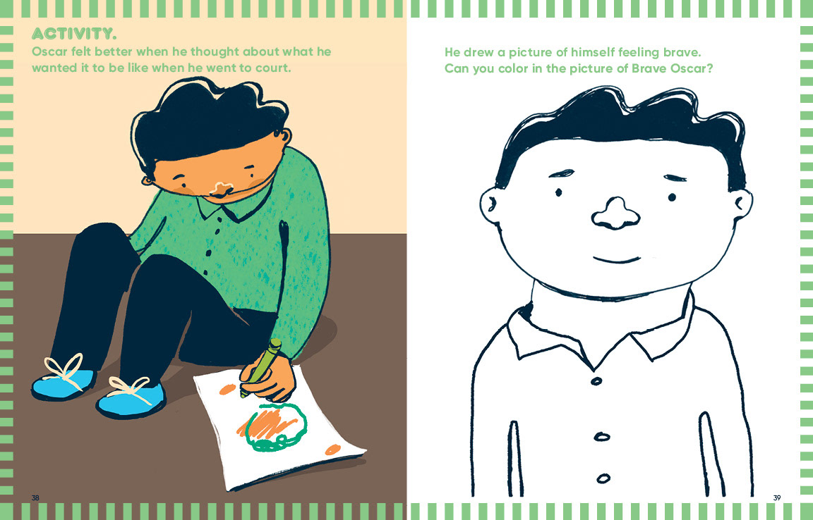 Above are stickers for an activity to help prepare children for what a courtroom will look like and who will be there, and below are activity pages and excerpts from Brave Maya, which tells the story of a family court case, and Brave Oscar, which tells the story of a criminal court case.