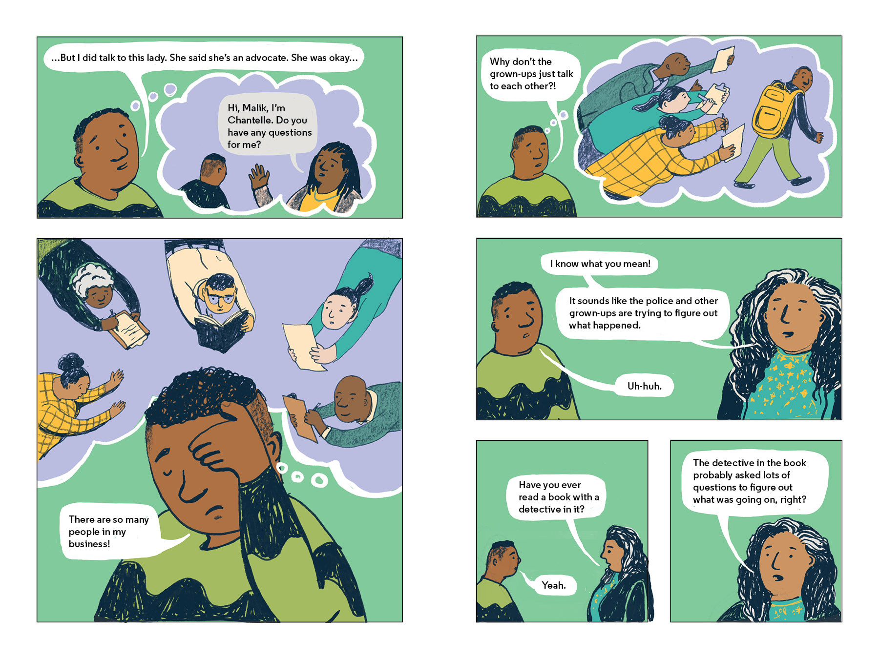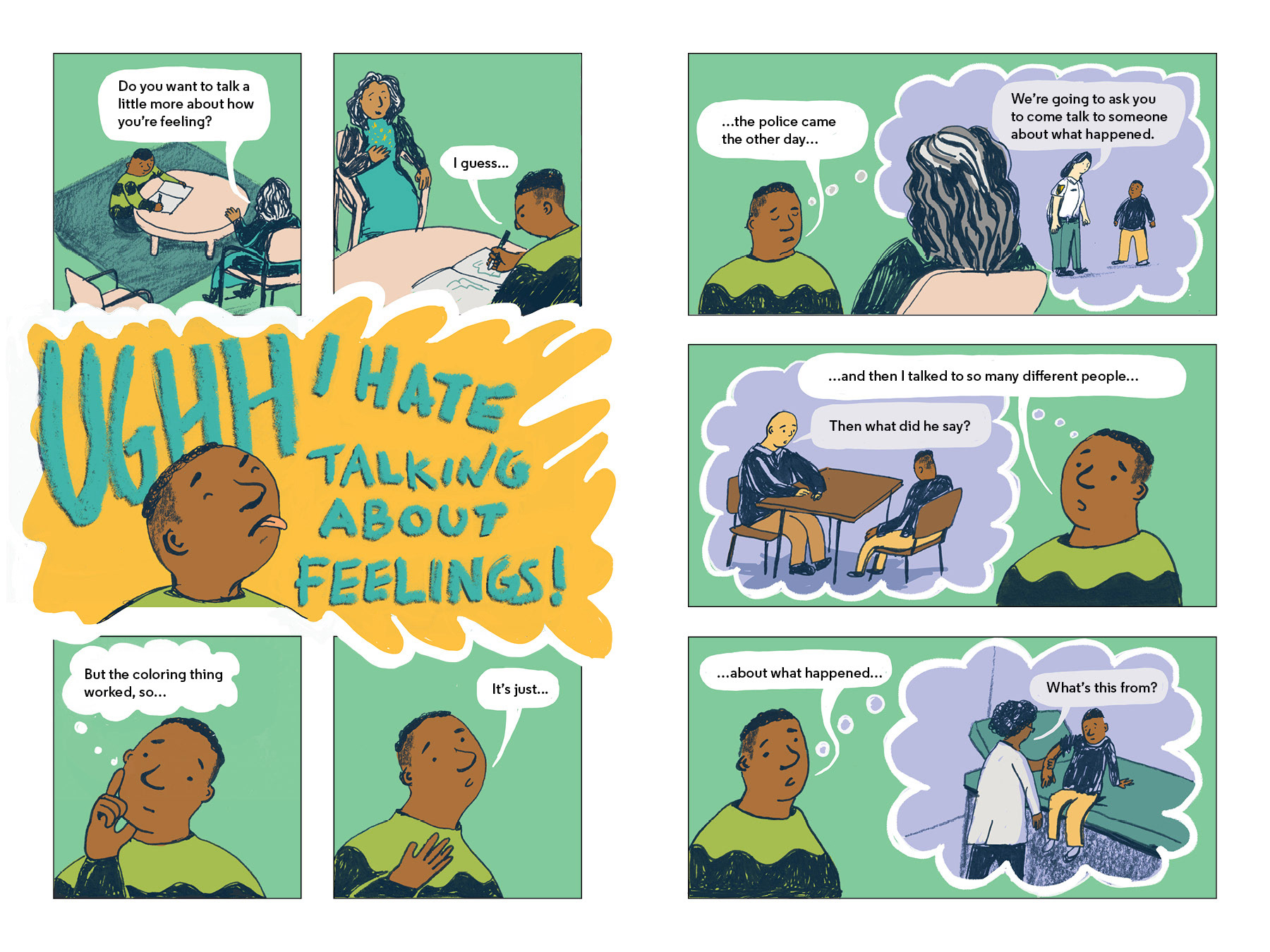 For this age group, there are three collections of short comics for teenagers involved in family court, criminal court, and trafficking cases. The narratives highlight stories where best practices and guaranteed rights are being granted to characters, and also stories of characters being forced to respond when their rights are violated. The intent is for this age group to be able to use the materials as a tool for for self advocacy if they experience unconstitutional treatment. As with the other age groups, there are also coping exercises included throughout the material, as well as prompts that empower teenagers to process and plan for life during and after their involvement with their court case.