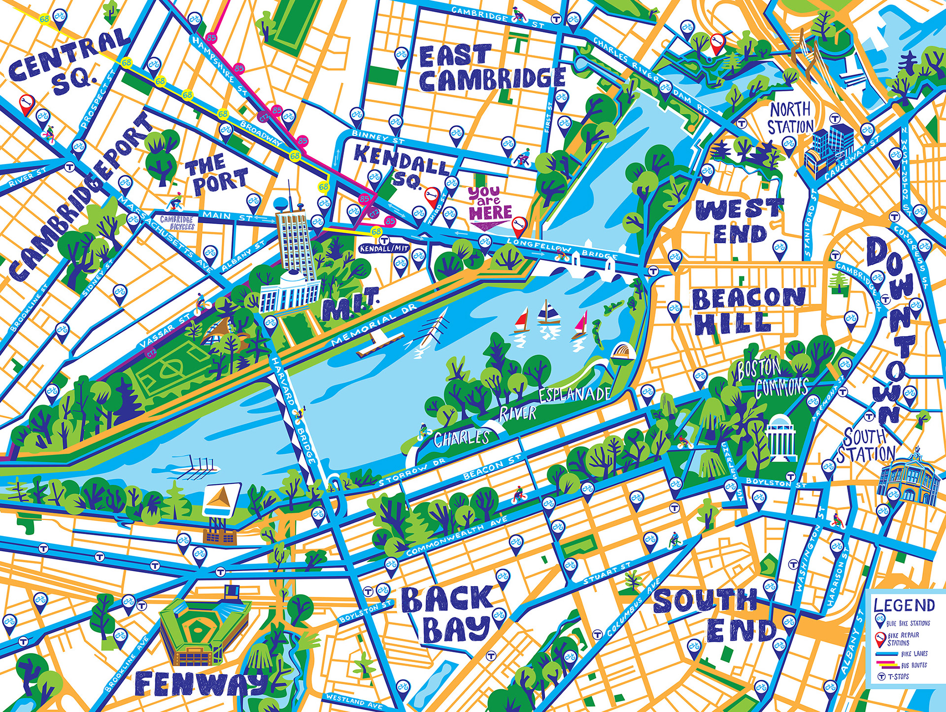 Illustrated map installed in a public bike room / Bluebike station in Cambridge, Massachusetts. Includes bike routes in Cambridge and Boston metro area, locations of Bluebike stations, bike repair stations, landmarks, and nearby bus routes and T stops. Commissioned by Bozzuto.
